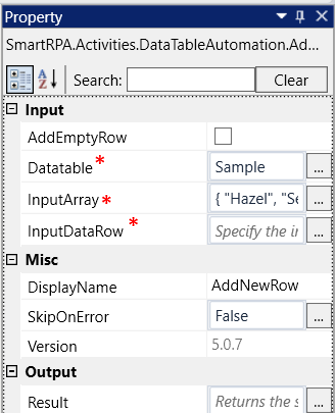 AddEmptyRow: To add an "Empty row" to the existing "Input datatable," choose this option. If not selected, the empty row will not be added. |
