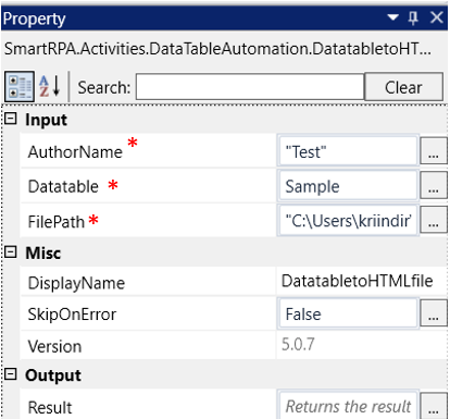 Datatable: Enter the "Input datatable" variable where the input data is stored. This parameter helps you to convert the “datatable” to “Htmlfile”. This field only accepts the "datatable" data type. |