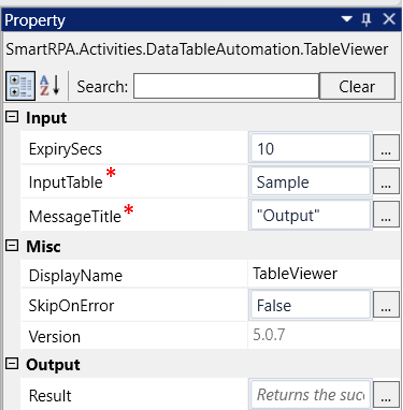 InputTable: Enter the "Input datatable" variable where the input data is stored. This parameter helps you to view the “datatable”. This field only accepts the "datatable" data type. |
