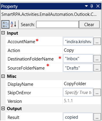 AccountName: Specify the name of the “Outlook account” from which the email needs to be accessed. This field accepts the value in "String" format. |