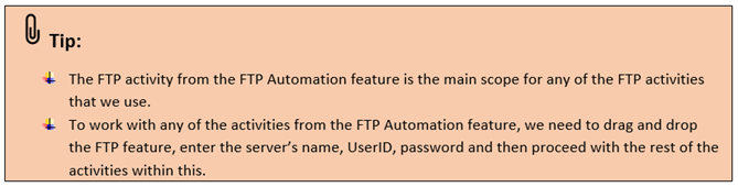 This activity is used to significantly increase security during transfer of files that are essential for automation. We can upload and download files, create, and remove directory and also see if a directory or file exists within the FTP feature.