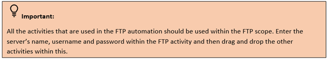 The following activity illustrates on how can use the upload activity from the FTP Automation feature to upload a file from the system to the server.