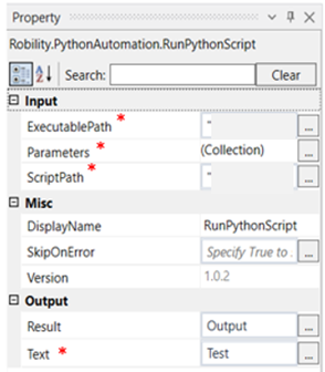 Parameters: Declare an argument type to give an input to the python file mentioned in the script path and also get an output of the updated script. |