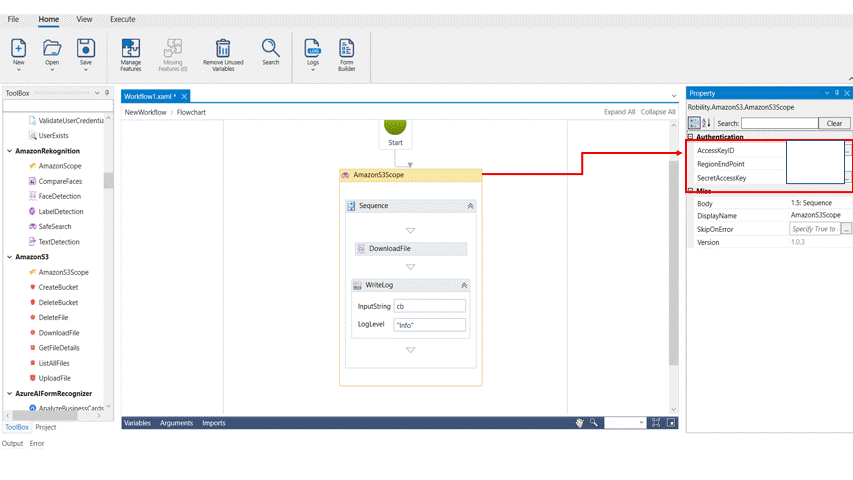 2. Click on the Amazon scope activity and enter the Access Key ID,Region End Point and Secret access Key which was given at the time of registration.