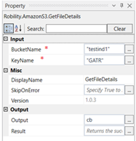 The following example illustrates how we can use the get file details activity to get the details of a specific file uploaded to a specific bucket. Here we are going to get the details of the file with key name “GATR” placed in the bucket “testind1”.