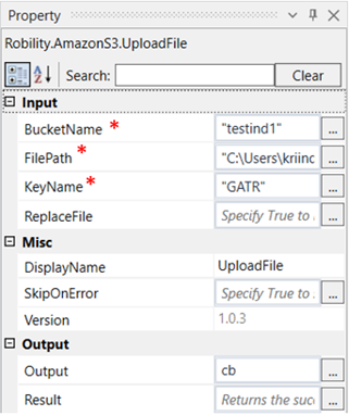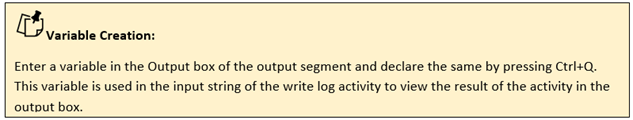 Output: Declare a variable here to see the result in an output box. This is not a mandatory field. However, to confirm if the file has been uploaded, a variable must be created here, to view the result in an output box. |