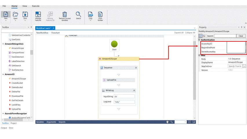 The following example illustrates on how we can use the upload file activity to upload a file into a bucket available in AmazonS3.
