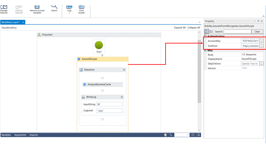 OutputJson: This is not a mandatory field. However, to view the result of the analyzed business card, a variable must be created here, to view the result in an output box. |