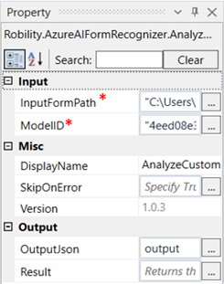 OutputJson: This is not a mandatory field. However, to view the result of the analyzed custom form, a variable must be created here, to view the result in an output box. |