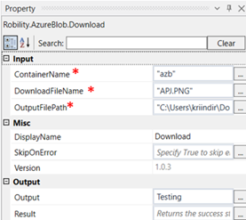 Output: This is not a mandatory field. However, to view the file name downloaded from the container, declare a variable here. |