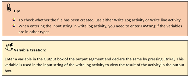 This activity is used to find if a particular file or directory exists in the specified path. This activity can be used along with a message box, write log, or write line activity to see if it exists.