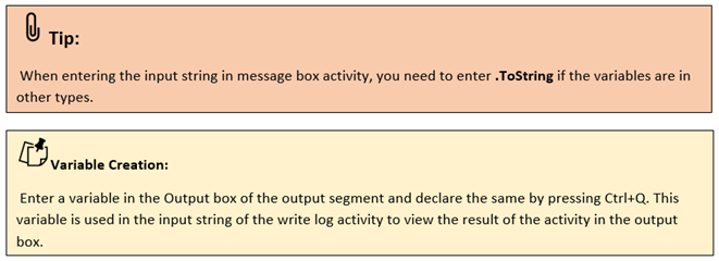 6. Add the variable as “Output.ToString” in the input string of the message box.