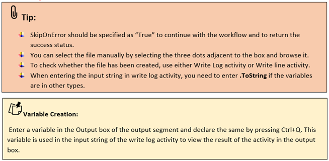SkipOnError: It specifies whether to continue executing the workflow even if it throws an error. This supports only Boolean value “True or False.” True: Continues to execute the workflow irrespective of any error thrown. False: Stops the workflow if it throws any error |