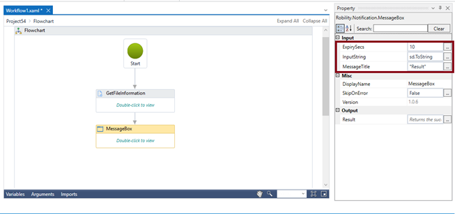 6. Drag and drop Message activity and connect below the Get File Information activity.