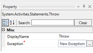 This activity is used to notify the exception message and terminate the process. It explicitly throws an exception that is defined by the user. Once the bot reaches the throw activity, it throws the exception message and ends the workflow.