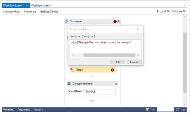 Now add Throw from error handling activity before the Delete worksheet activity.