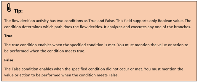 This activity is used when the flow can be branched into two paths. The node will have a condition and a flownode associated with each of the two possible outcomes: True or False. The condition is evaluated, and the value of this evaluation determines the next step of execution in the workflow.