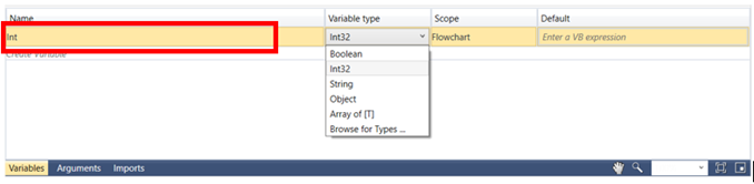 1. Drag and drop an assign activity from Primitives. Select the assign activity and choose the variables option. Choose the variable option, assign the variable “int” and select “int32” as the variable type.