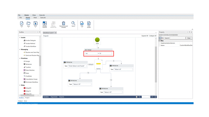 The following activity illustrates how we are going to use the FlowSwitch activity along with an assign activity. It shows if the given number goes through the FlowSwitch and declares the right value.