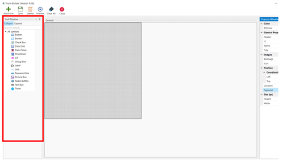 The tool window allows us to add controls to the form.
