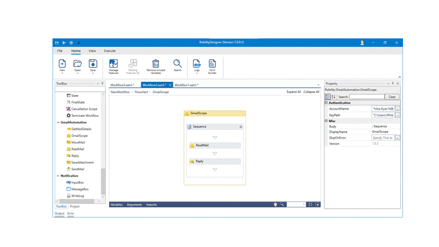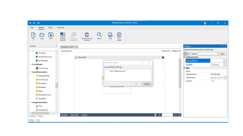 The Gmail automation enables the user to extract, send, reply, move, read, and save from the mails. Before proceeding to process the automation, the bot authenticates the gmail/ mail account that is specified. This process occurs only on the first time when the activity is used with the mail account entered. This keypath entered in Gmail scope will enable to give access to the mail account specified and only accepts JSON file format.