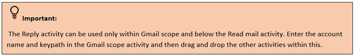 The following activity explains how to reply to the mail by using the Reply activity. The activities that needs to be used – Gmail scope, Read mail, Reply and Write log.