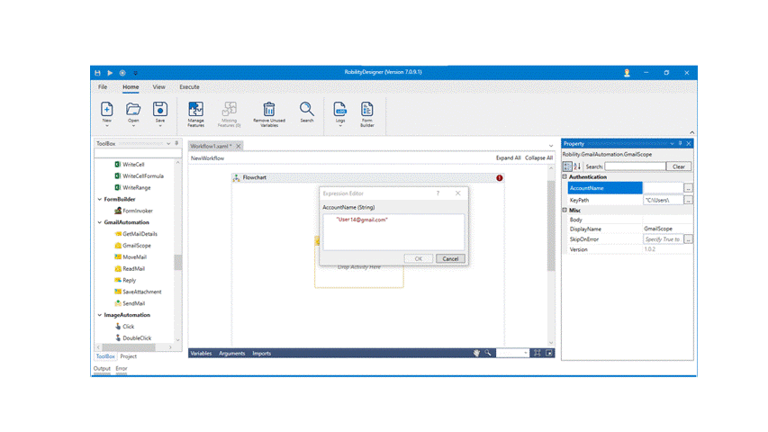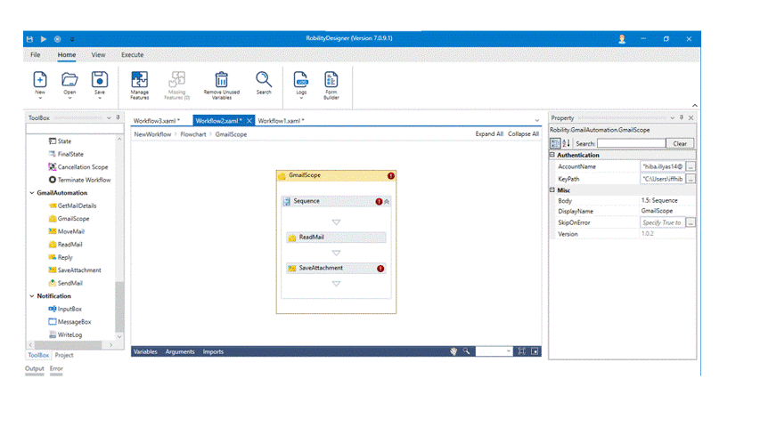 The Gmail automation enables the user to extract, send , reply, move, read, and save from the mails. Before proceeding to process the automation, the bot authenticates the gmail/ mail account that is specified. This process occurs only on the first time when the activity is used with the mail account entered. This keypath entered in Gmail scope will enable to give access to the mail account specified and only accepts JSON file format.