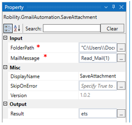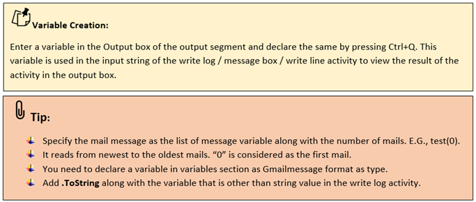 MailMessage: Specify the list of message variable from the read mail activity as the input to extract the attachments from the mail. |