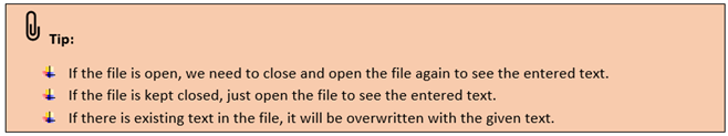 The following activity illustrates on how we can use the write text activity to enter text to a given file during the run time. Here we will be entering text to the file “OSTest” which is on the desktop.