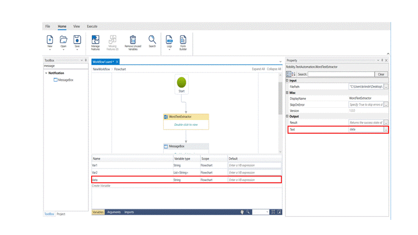 5.Drag and drop a message box below the word text extractor activity to view the copied text.