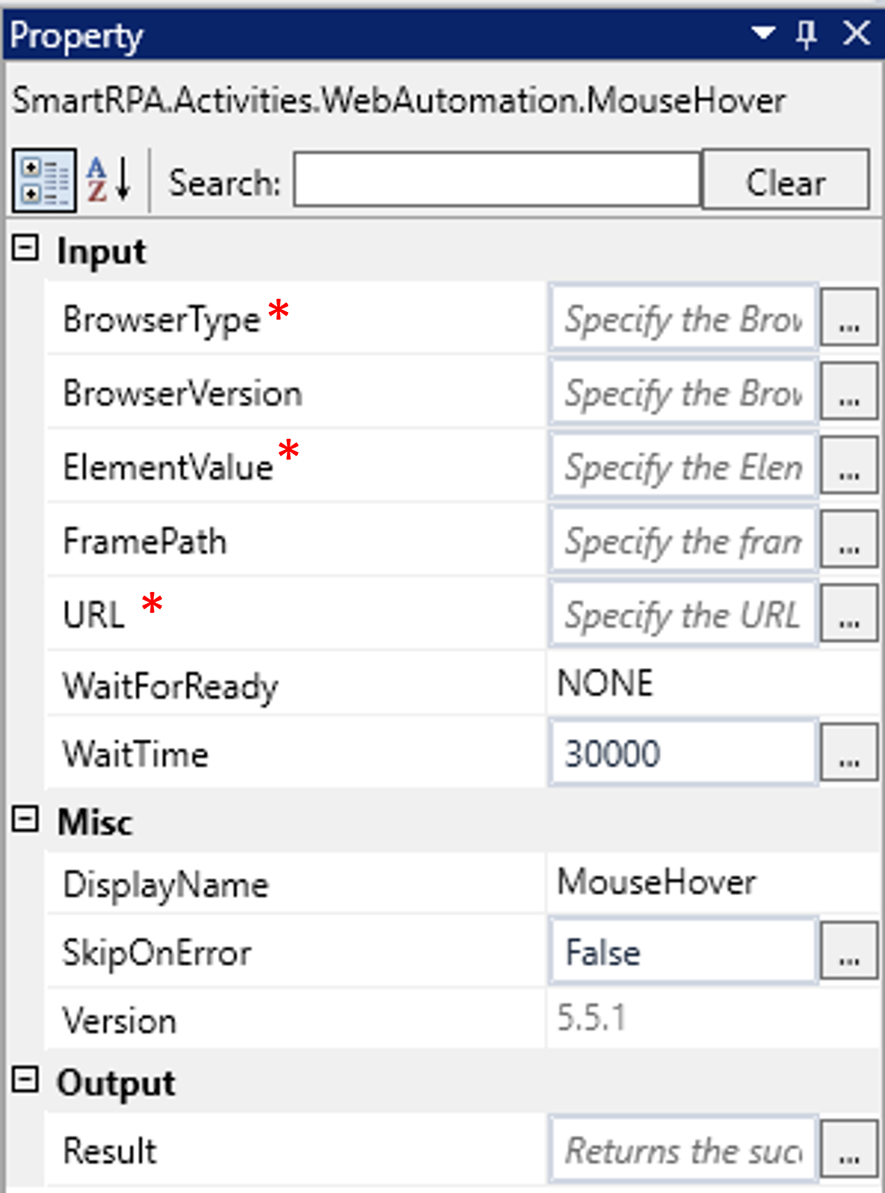 URL: Gets auto filled, once the element is indicated on the web page using Robility Spy. Indicates the URL in which this activity is performed. |