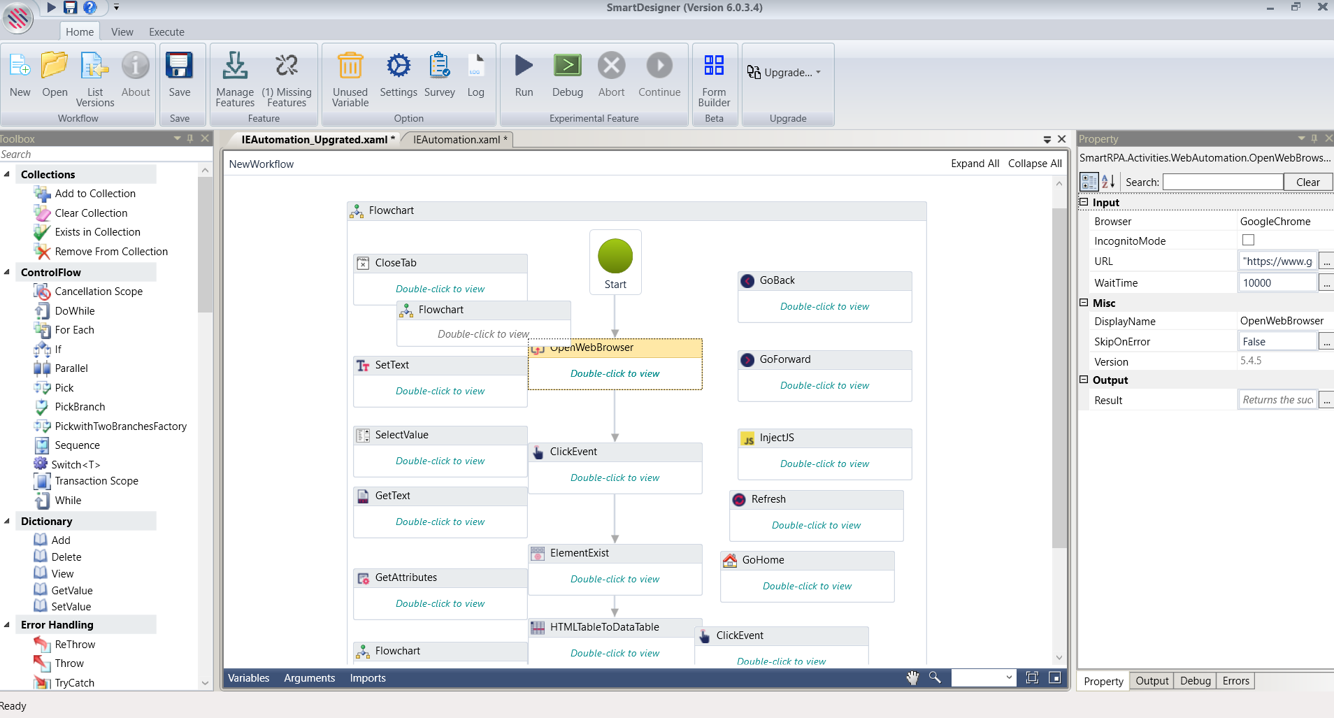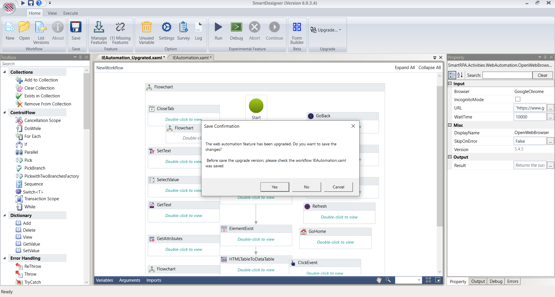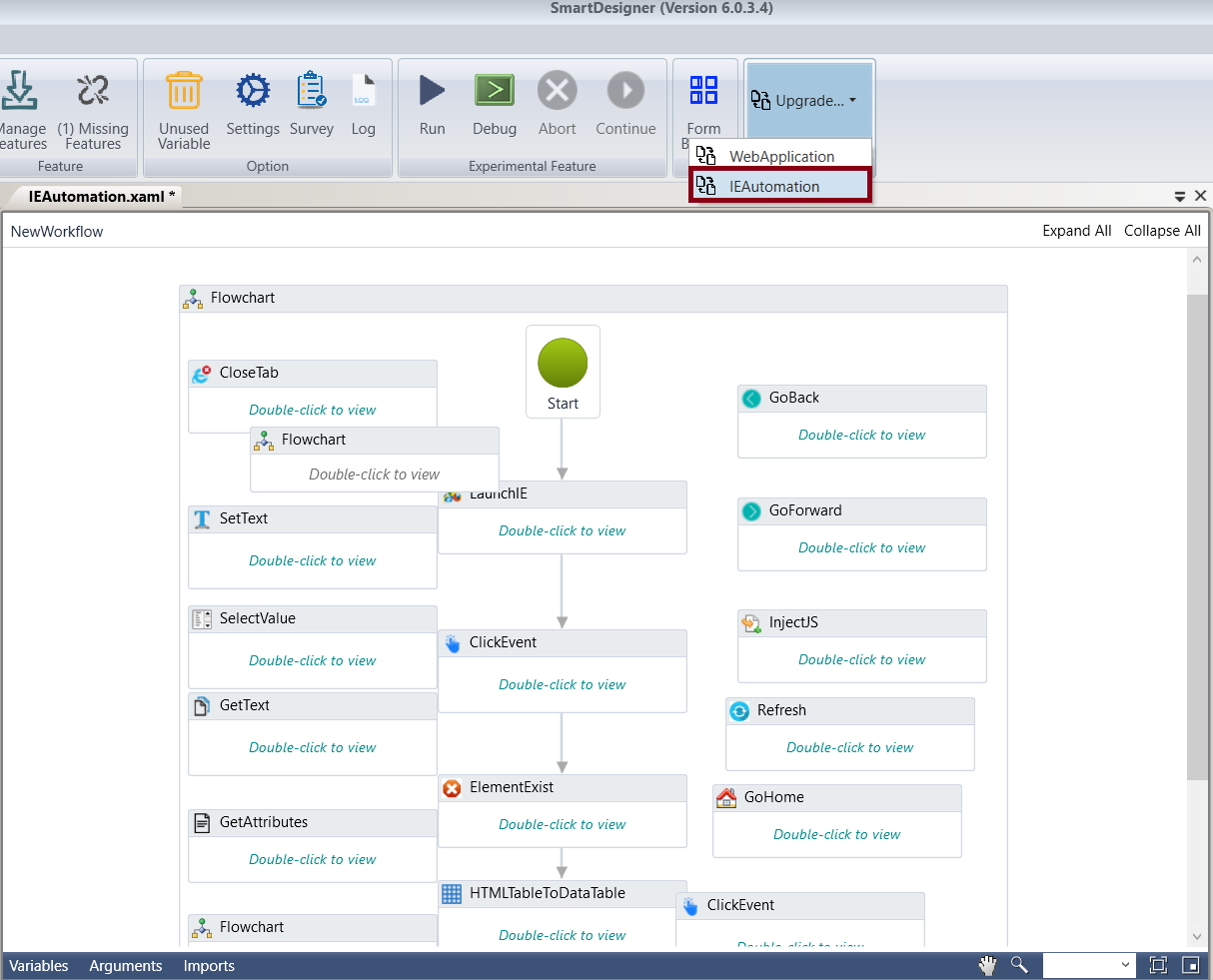 This feature has been included to the Designer to help the user upgrade Internet Explorer Automation activities in workflow to the latest compatible WebAutomation activities.