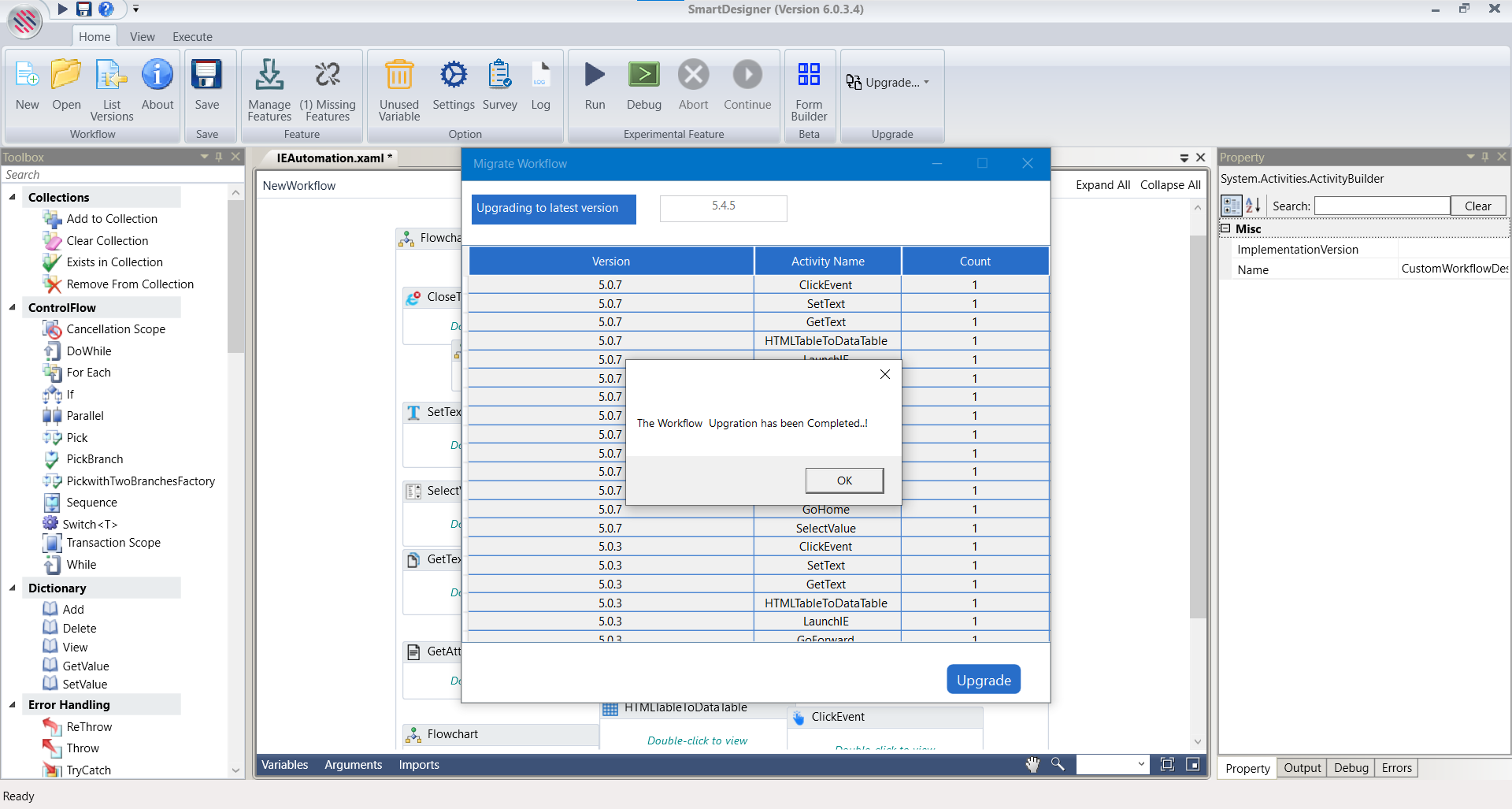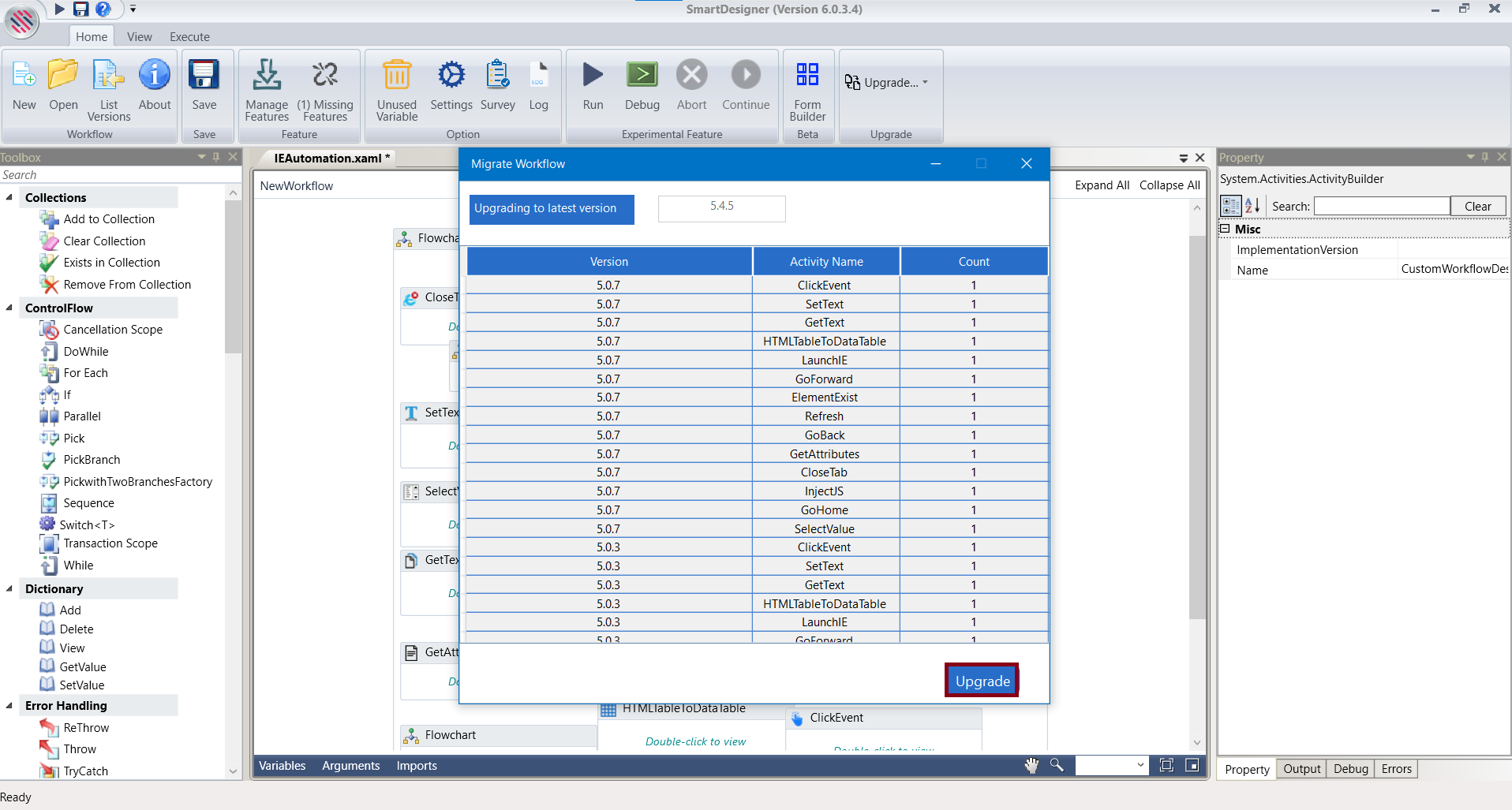 • From the dropdown, select IE Automation to upgrade the activities.